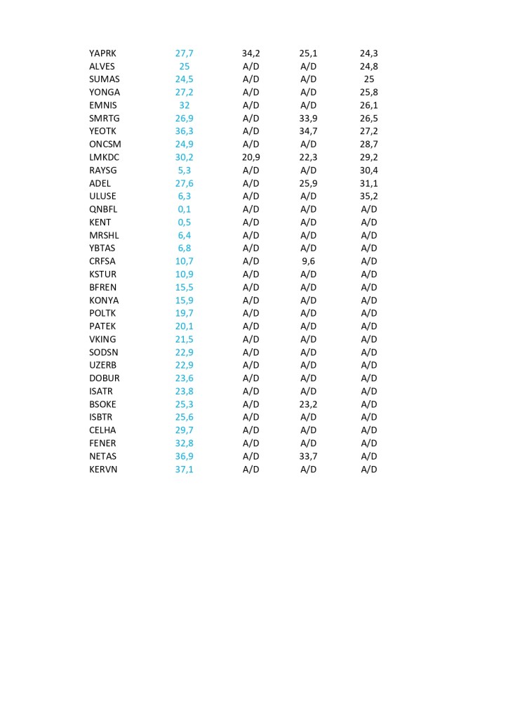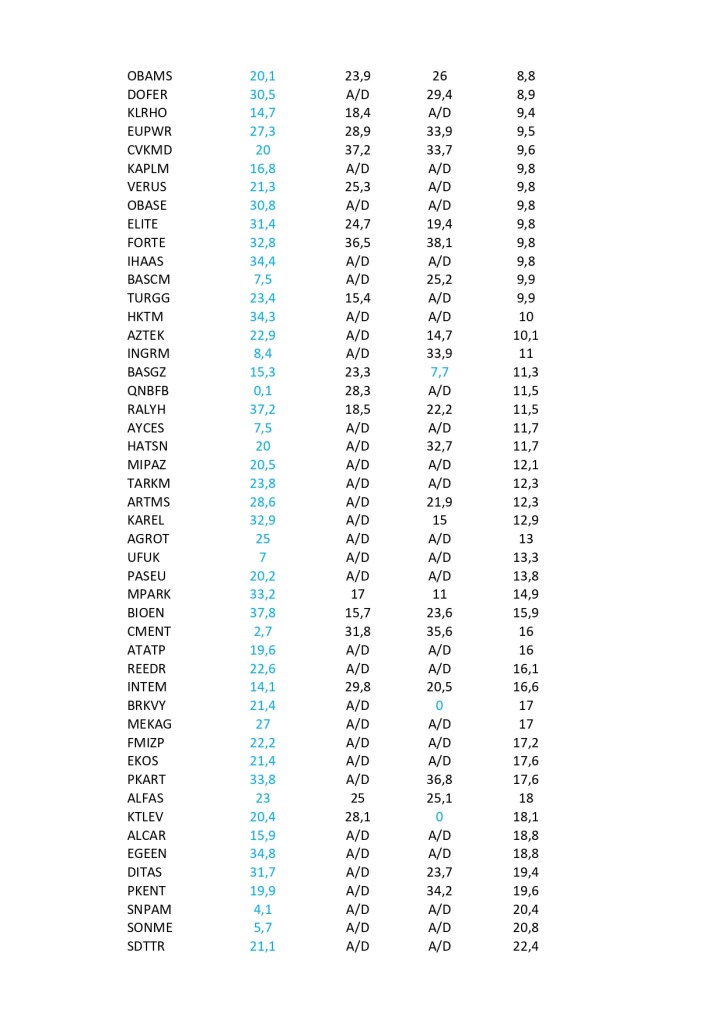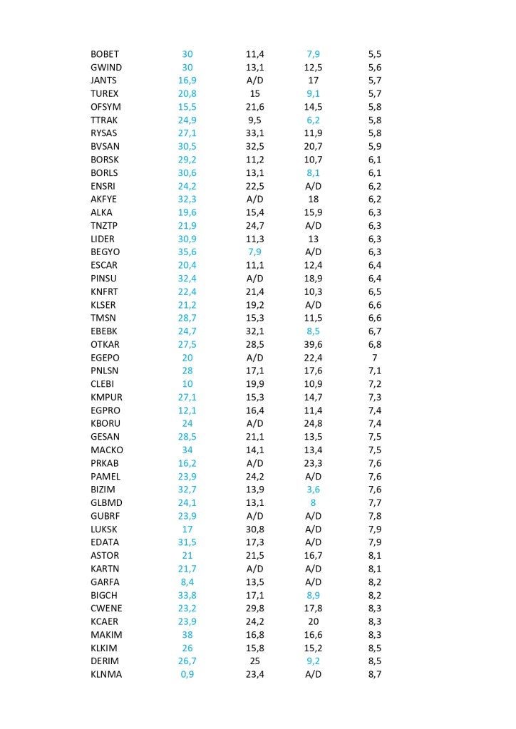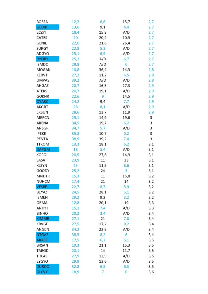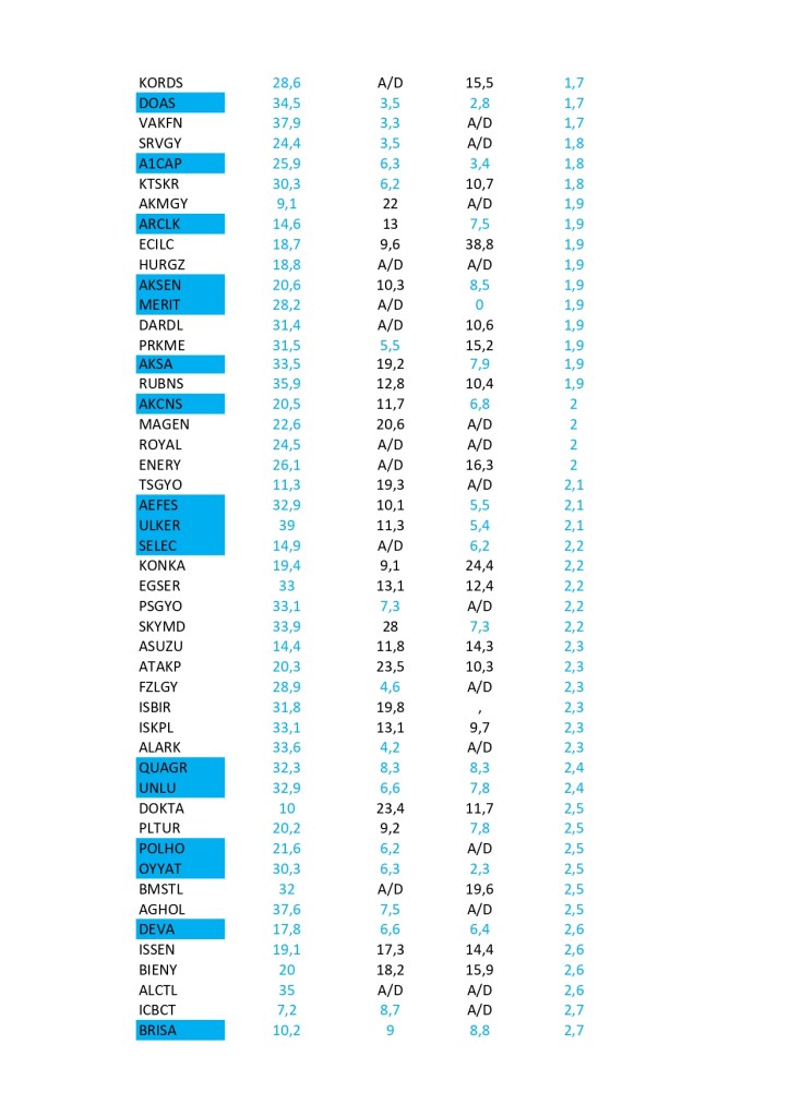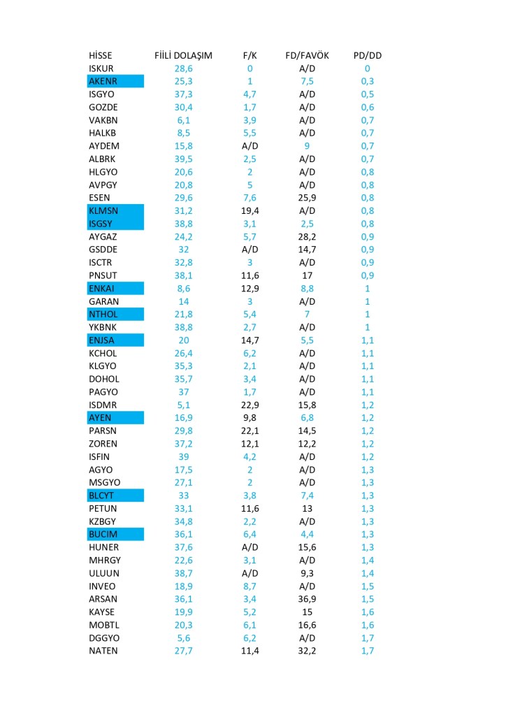 Bist 100 rekorlar kırdığı ve gücünü de hiç yitirmeyi düşünmediği bu günlerde Halka açık şirketlerin Piyasa değerinin defter değerlerine oranla ucuz kaldığı hisselerin sıralaması aşağıdaki gibidir. Burada ayrıca sadece piyasa değeri sıralamanın yeterli olmayacağı düşünüldüğünden fiili dolaşım, fiyat / kar endeksi , Favökler ile birlikte her kritere göre geride kalmış hisseler taranmıştır. Listeler PD/DD sıralamasına göre şekillenmiştir. Fiili dolaşımı %40 altında olanlar , fk ve favök te ise ilk 100 hisse taranmıştır.
