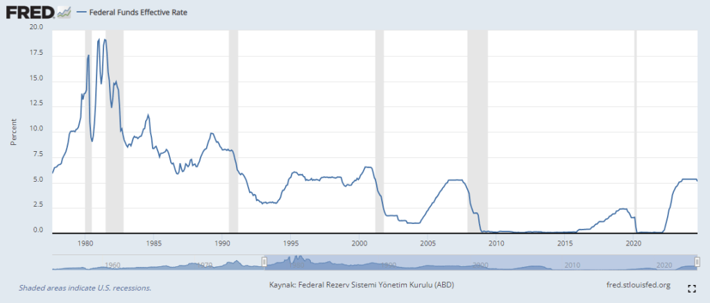 - Düşük Faiz Oranları : Faiz oranları düşük olduğunda, borç para almak daha ucuz hale gelir. Bu, yatırımcıları piyasada var olan tüm yatırım araçlarına yatırım yapmak için daha fazla borç almaya teşvik eder, fiyatları yükseltir ve potansiyel olarak bir balona yol açar. Aşağıda Amerikan Merkez Bankası FED’in faiz oranlarına bakıldığında son yıllar haricinde sürekli indirim uygulandığı görülmektedir.