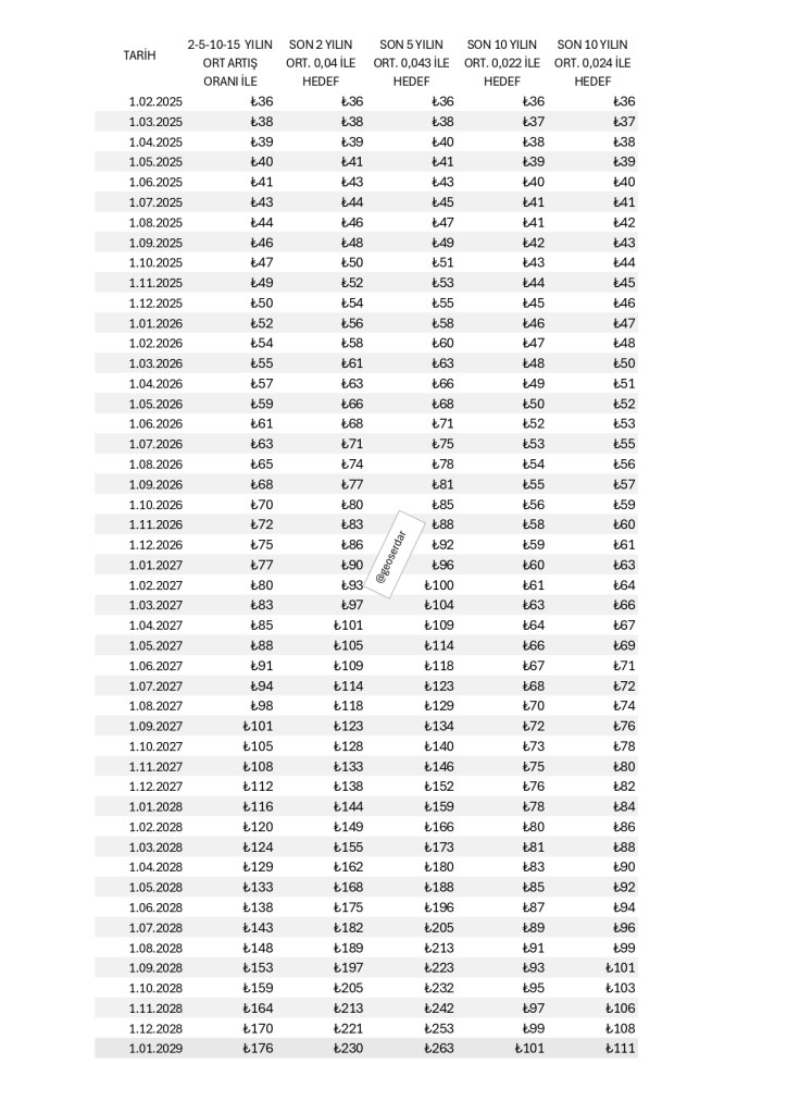 2-5-10-15 yılın aylık ortalama değerlerin ortalaması ile de 2029 ocak ayına kadar bu değerler ile çarpımı sonucu tahmini fiyat oluşmuştur. Yatırım amaçlı bu fiyatları esas almak yanıltıcı olabilir. Sadece fiyat dizilimi geçmiş oranlar aynı şekilde kaldığı çarpımı sonucunda oluşan rakamlardır. tahmin arz etmez.