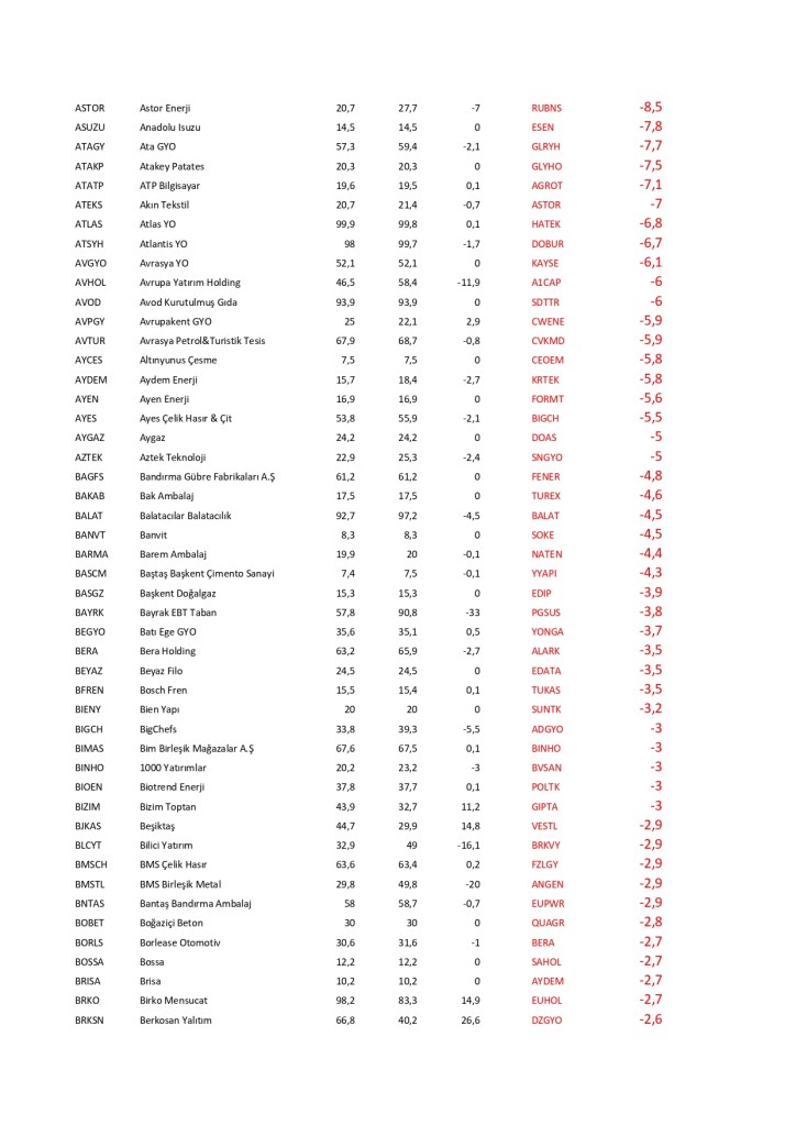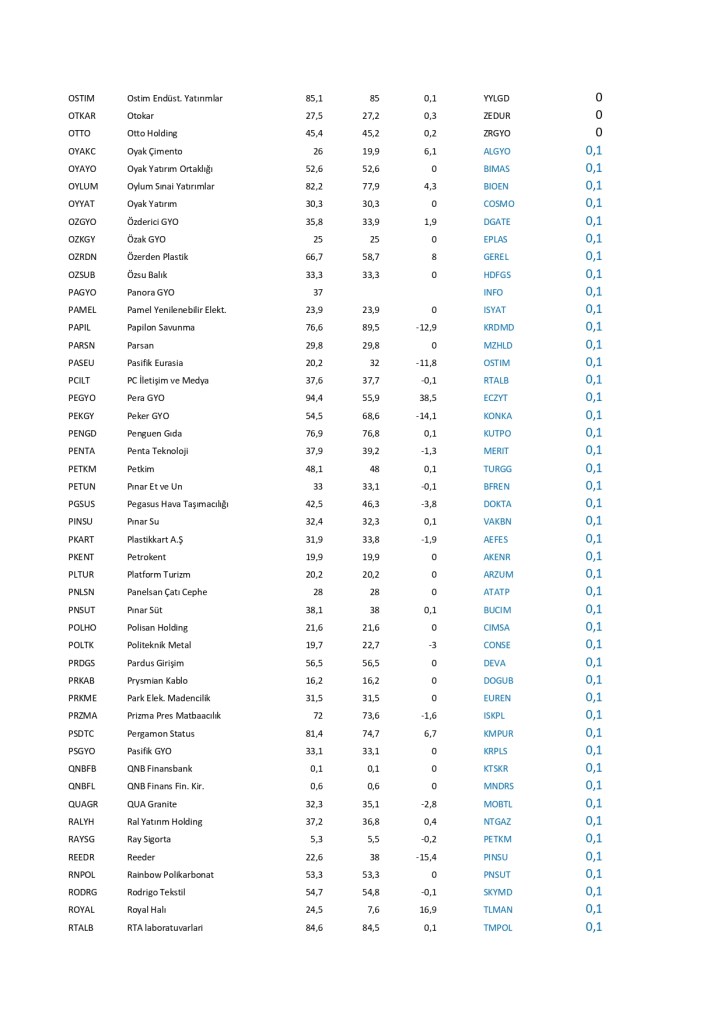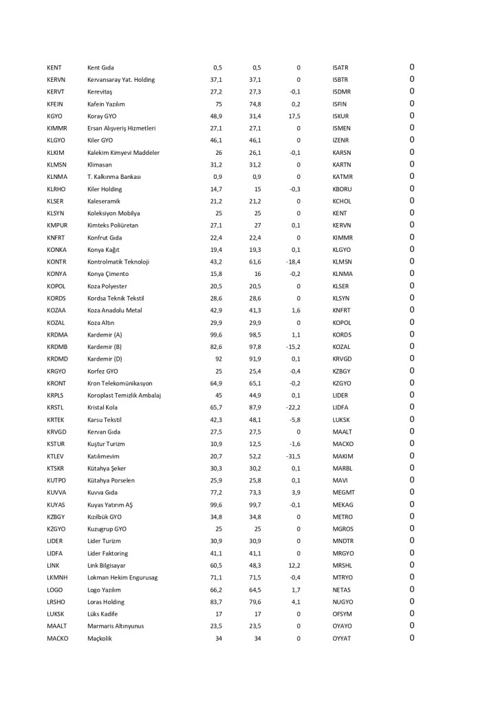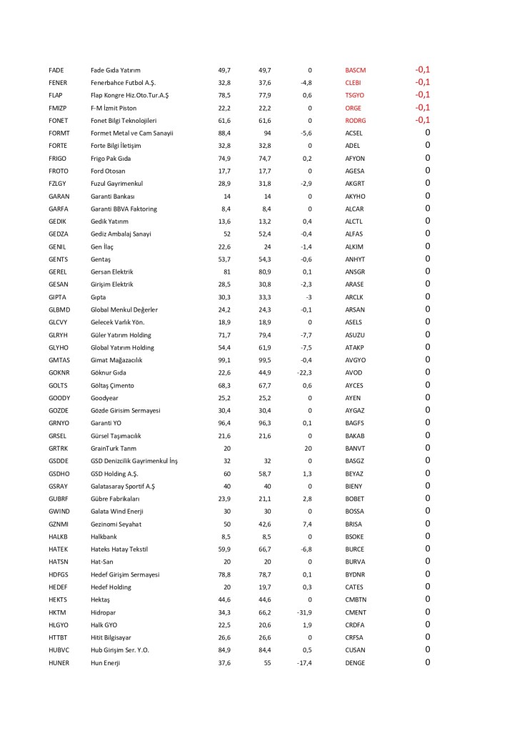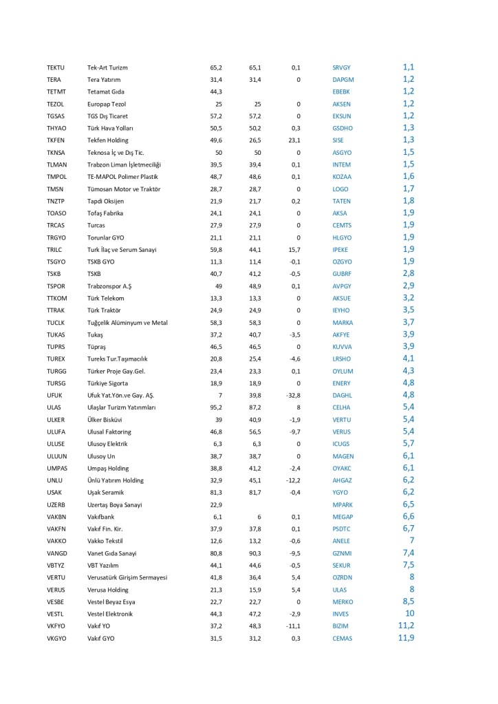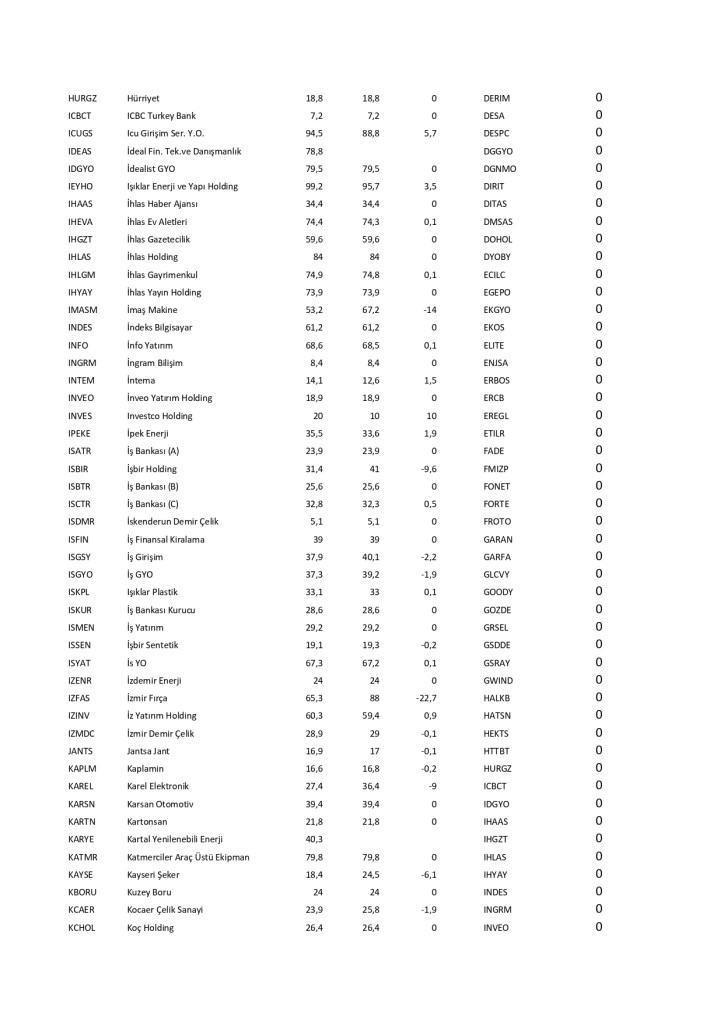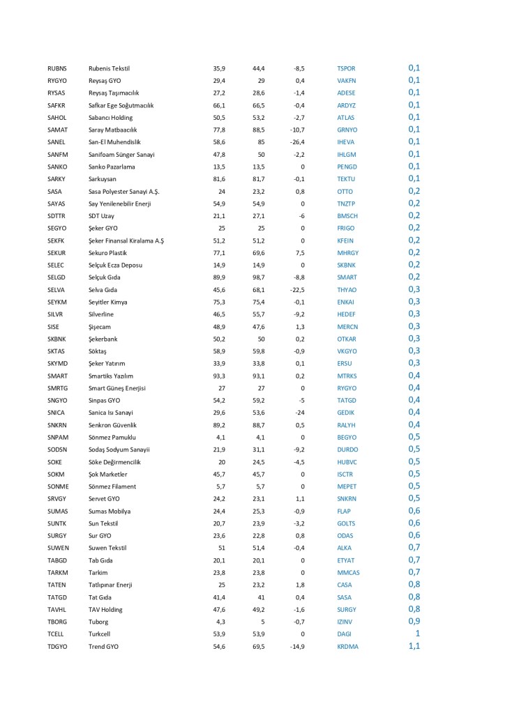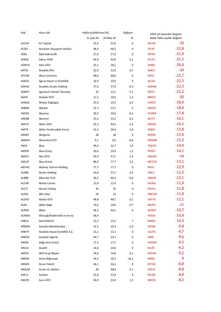 Borsa İstanbul’da işlem gören hisse senetlerinin fiili dolaşımdaki hisse oranlarında çok ciddi değişim olmuştur. Bu değişimler şirketlerin hisse senetlerinde şirketin ağırlığının azalması olumlu olarak karşılanmazken, hisse senetlerinde şirketin ağırlığının artırması olumlu karşılanır. Halka arz oranında genel olarak azalma gözlenirken bu da şirketlerin hisse satışını artırdığı görünüyor. Özellikle yeni şirketlerde bu değişim çok dikkatle izlenmeli; patronların hisse satışının devamında fiyatların olumsuz devam edebileceği düşünülmektedir. Tek başına halka arz oranları değişimi hisse senedi seçiminde yeterli olmaz; lakin sürekli hisse satan şirketlerin mali durumuna dikkat kesilmek gerekebilir.